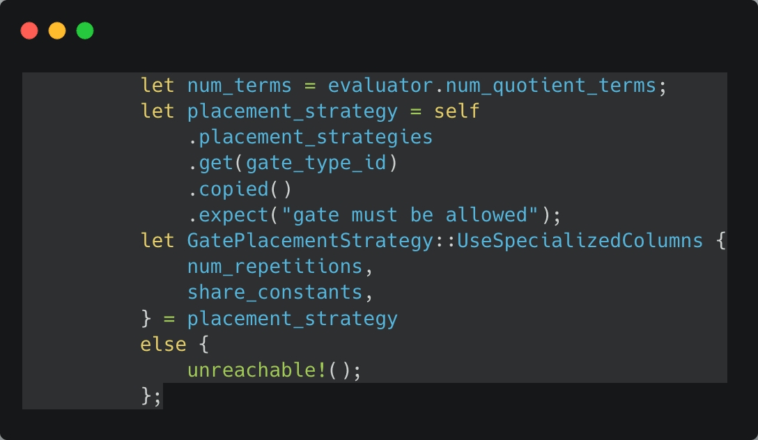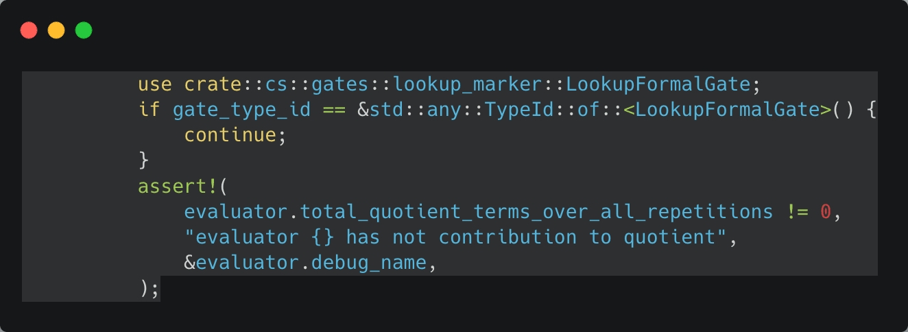 If gate_type_id is a LookupFormalGate, we don’t need to do anything in this loop because it is handled by the lookup table. For all other cases, we need to check the evaluator’s total_quotient_terms_over_all_repetitions is non-zero.