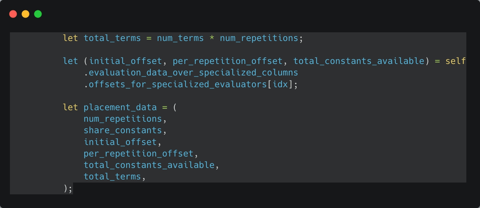 Next, we get num_terms, num_repetitions, and share_constants, total_terms, initial_offset, per_repetition_offset, and total_constants_available. All of these together form our placement data.