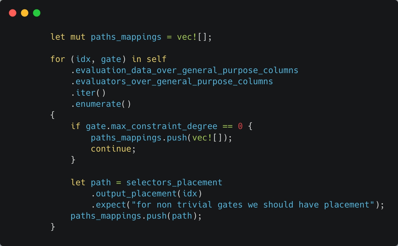 Next we create the paths_mappings. For each gate in the circuit, we create a vector of booleans in the correct shape. Later, when we traverse the gates with actual inputs, we’ll be able to remember which gates should be satisfied at particular rows by computing the corresponding selector using constant columns and the paths_mappings.
