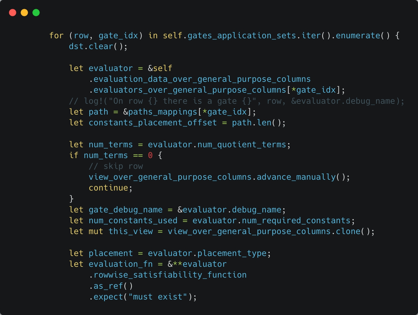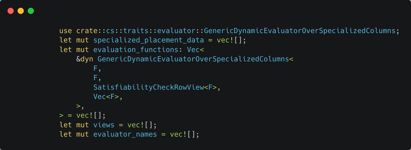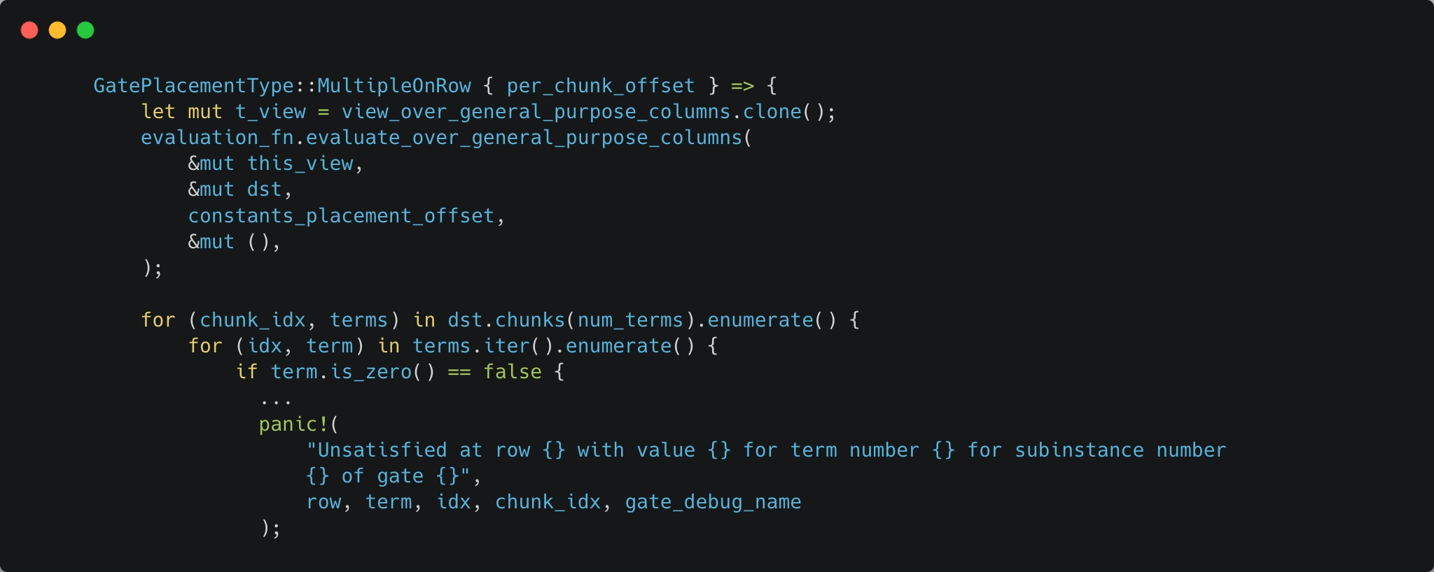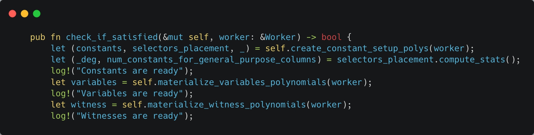 Our circuits (and tests) depend on a function from Boojum called check_if_satisfied. You don’t need to understand it to run circuit tests, but it can be informative to learn more about Boojum and our proof system.