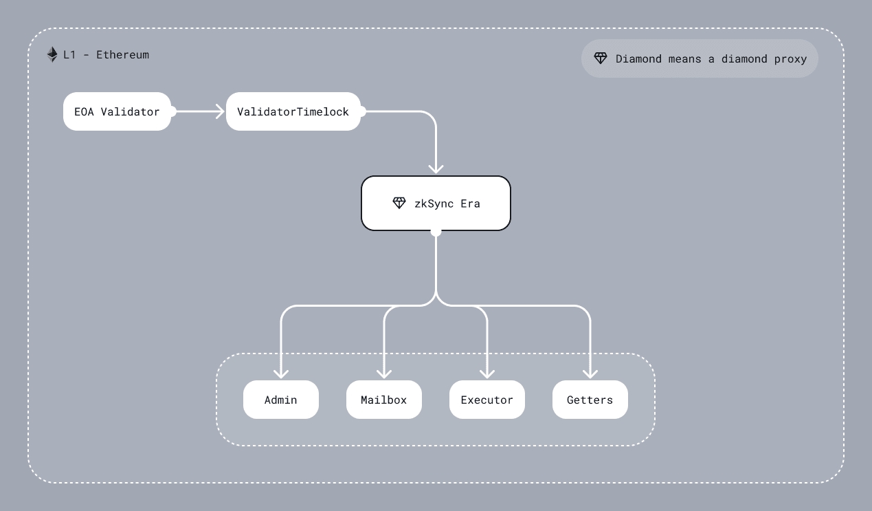 The diamond proxy pattern is very flexible and extendable. For now, it allows splitting implementation contracts by their logical meaning, removes the limit of bytecode size per contract and implements security features such as freezing. In the future, it can also be viewed as EIP-6900 for ZK Stack, where each ZK Chain can implement a sub-set of allowed implementation contracts.